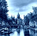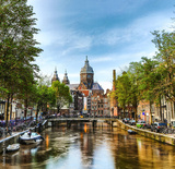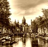 The most famous canals and embankments of Amsterdam city during sunset. General view of the cityscape and traditional Netherlands architecture.