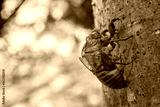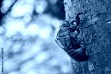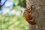 夏らしい風景。木漏れ日に照らされた蝉の抜け殻のクローズアップ。