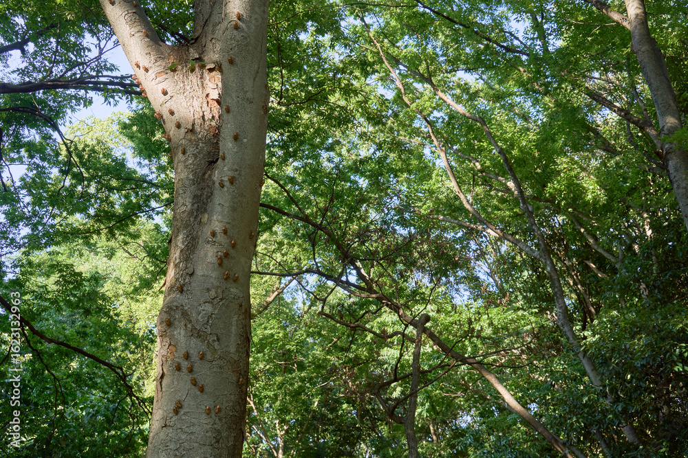 夏らしい風景。木の幹にびっしり付いた蝉の抜け殻。