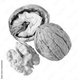 Walnuts showing whole, cracked and shelled states on transparent background