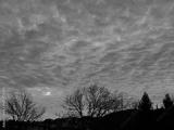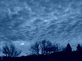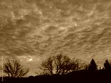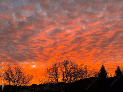 Vibrant orange sunset with dramatic clouds and silhouetted trees