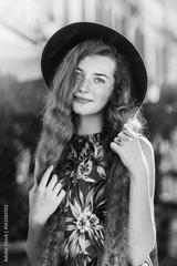 Outdoor waist up portrait of young beautiful happy smiling redhead girl with freckles, long curly hair, no makeup. Model posing in street. Summer sunny day. Female natural beauty, happiness concept