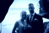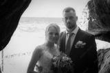 Bride and groom share a tender moment inside a sunlit cave by the beach, with ocean in the background and bouquet in hand.