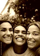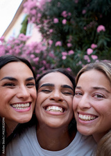 Vertical. Three cheerful young women posing together outdoors, their faces close and radiating joy, embodying genuine happiness and a strong bond of friendship in a vibrant urban setting