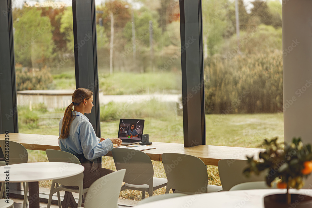 A woman is working intently on her laptop at a stylish, contemporary workspace featuring a lush, natural backdrop