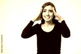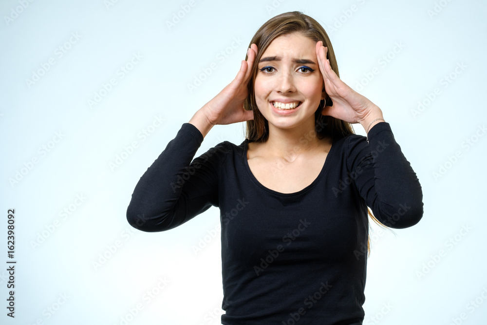 Young pretty brunette girl touching her head