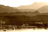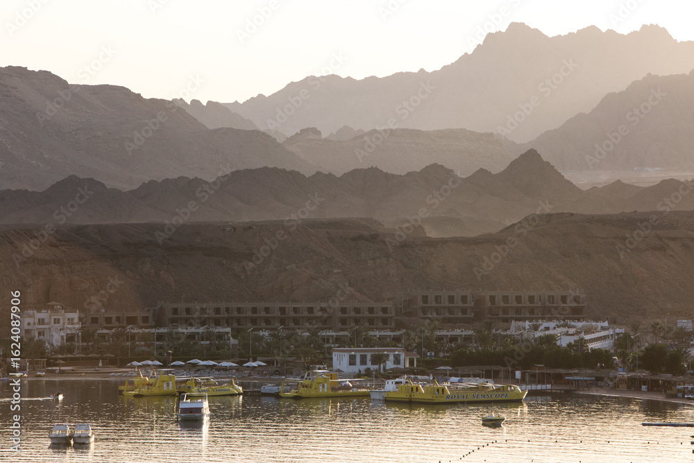 Sharm El Sheikh, Egypt - May 15, 2019: Popular yellow glass-bottom boats for fish watching tours at sunset