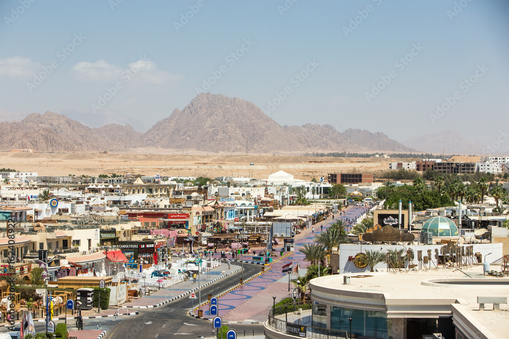 Naama Bay, Sharm El Sheikh, Egypt - May 9, 2019: Panoramic view of Naama Bay tourist area with desert mountains and urban buildings