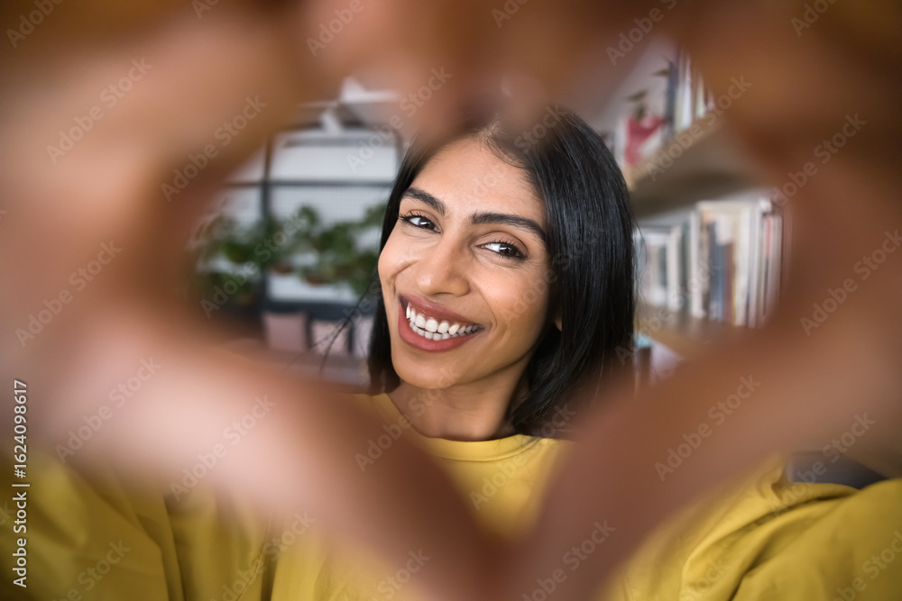 Close up happy face of young 30s cheerful Indian female with bright perfect smile. Book lover portrait framed through heart shape formed by her hands, symbolizes love, posing in library or bookshop