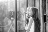 Two cute little sisters watching animals in the zoo on warm and sunny summer day