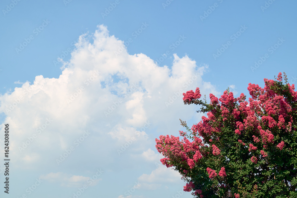 青空に浮かぶ白い雲と赤い花のコントラストが美しい、夏をイメージする背景用素材