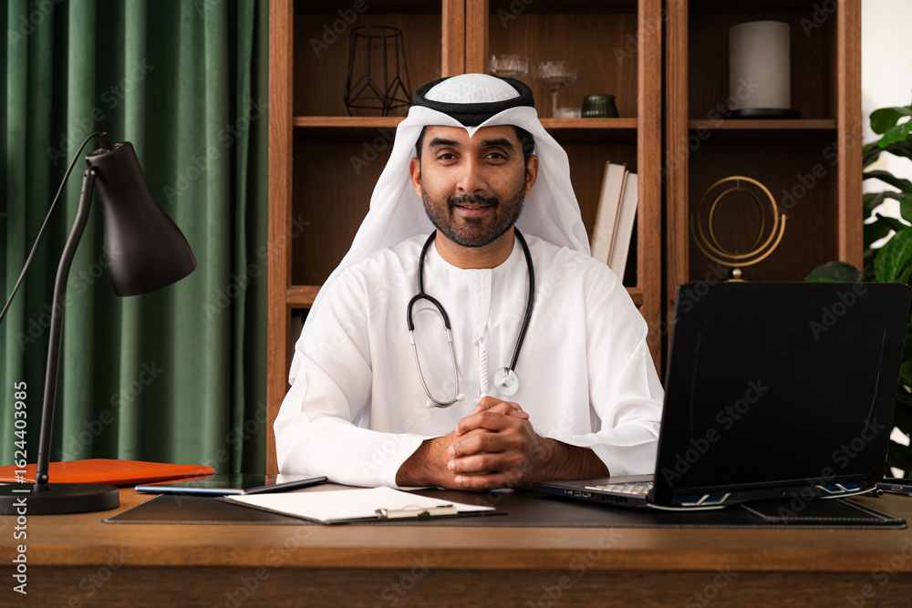 Middle-eastern doctor wearing emirati kandura working in the office - emirati doctor sitting at desk in dubai office