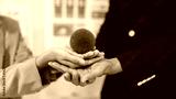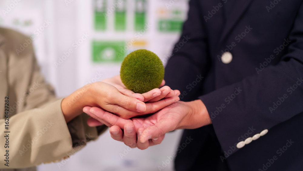 Adult business professionals hands hold green earth sphere for environmental corporate sustainability global partnership and ecological responsibility