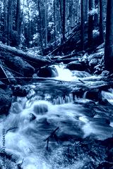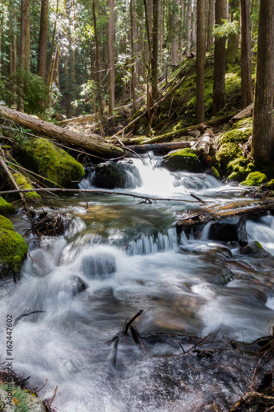 A rushing waterfall over rocks in the middle of a forest surrounded by trees