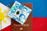 Philippines peso currency money bills and passport lies on flag. The concept of travel and vacation