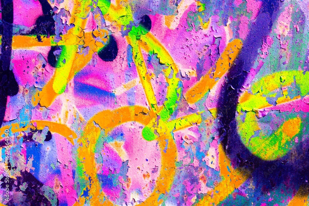 Vibrant neon graffiti texture in pink, green, orange with cracked paint effect. Funky 80s, acid style adds dynamic feel. Posters, urban art, digital backgrounds, modern 90s visuals.