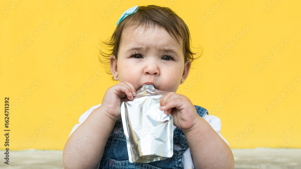 Squeeze pouch mockup on yellow background for food or fruit packaging
