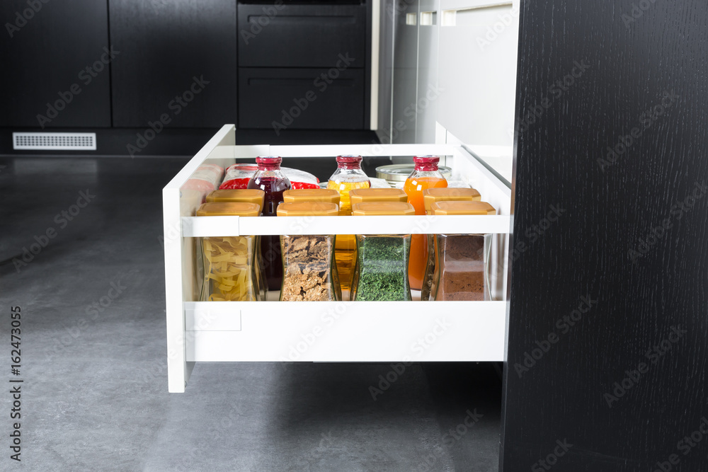 Side view of a spices and groceries organized in a modern kitchen drawer. Kitchen design inspiration.