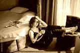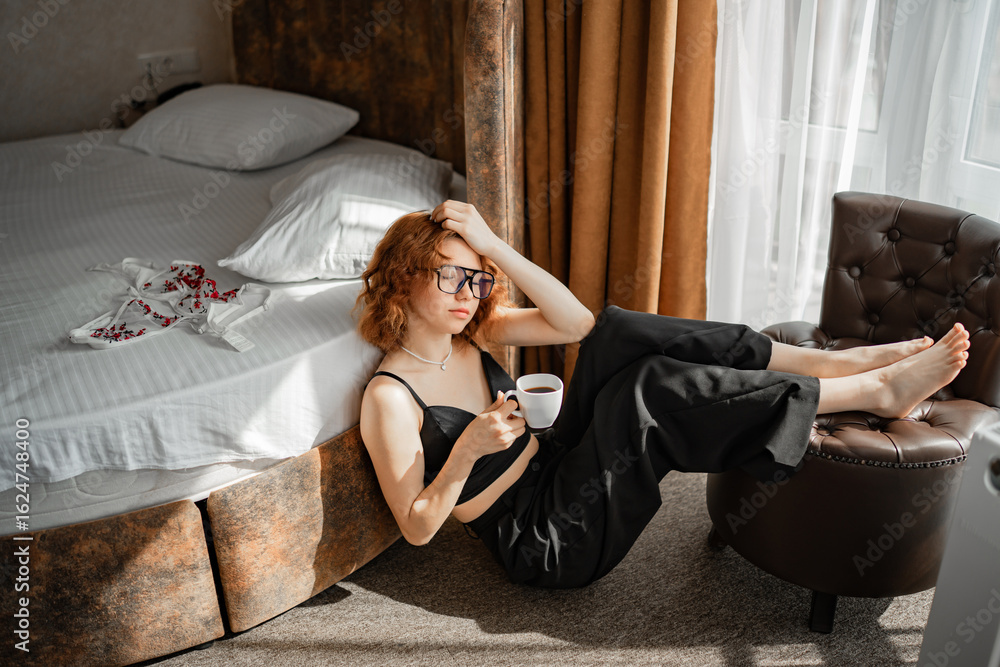Woman enjoying a quiet morning with coffee in a cozy hotel room