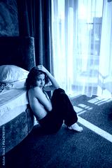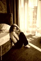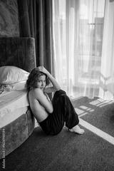 Woman sitting by the bed in a sunlit room, experiencing a moment of reflection
