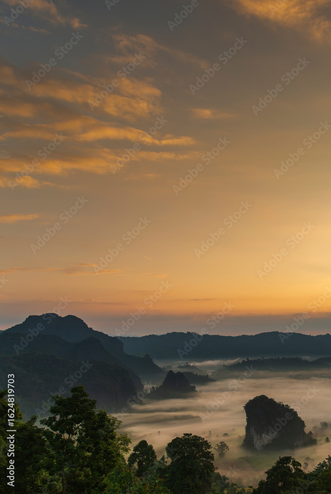 Vertical Beautiful Mountain landscape foggy windy mountain range green landscape asian farm. Vertical Amazing Landscape mountain green field meadow white cloud blue sky sunrise. Countryside scenery