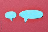 Blue blank cut out paper speech bubbles with copy space for text on red background, flat lay top view conceptual conversation backdrop
