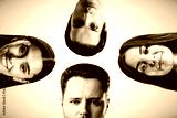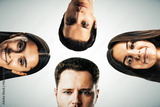 Group of young diverse people looking down in a circle with smiling and serious expressions on a light gradient background, symbolizing unity and teamwork.
