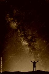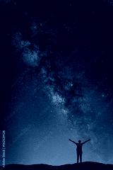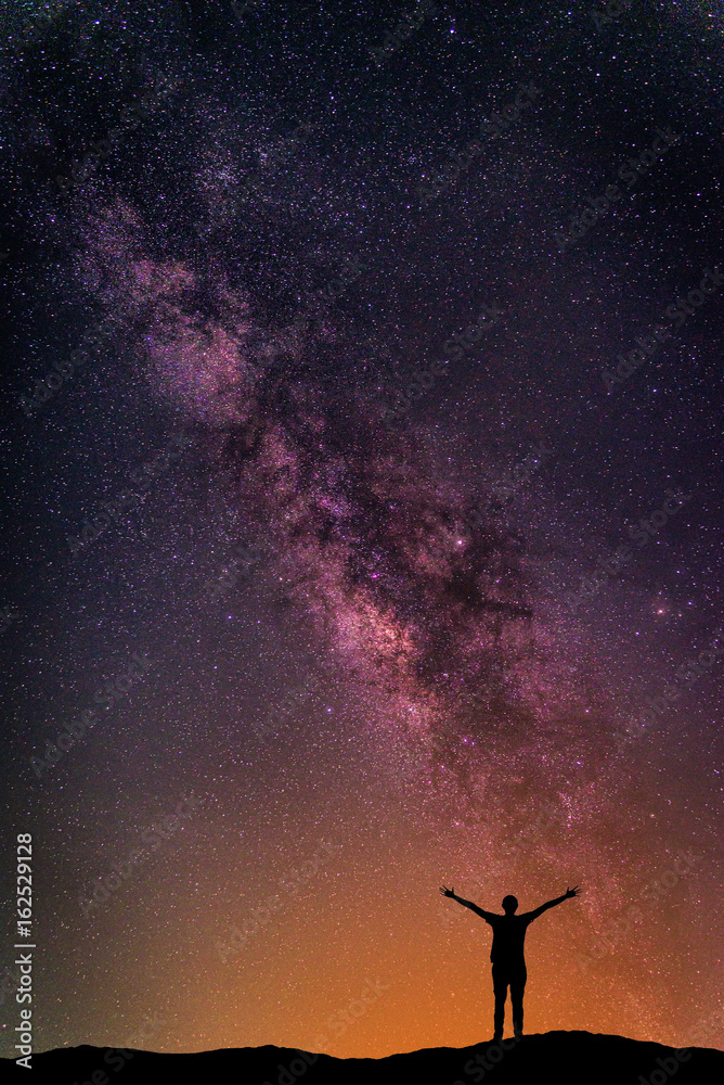 Landscape with Milky way galaxy. Night sky with stars and silhouette happy man on the mountain. Long exposure photograph.