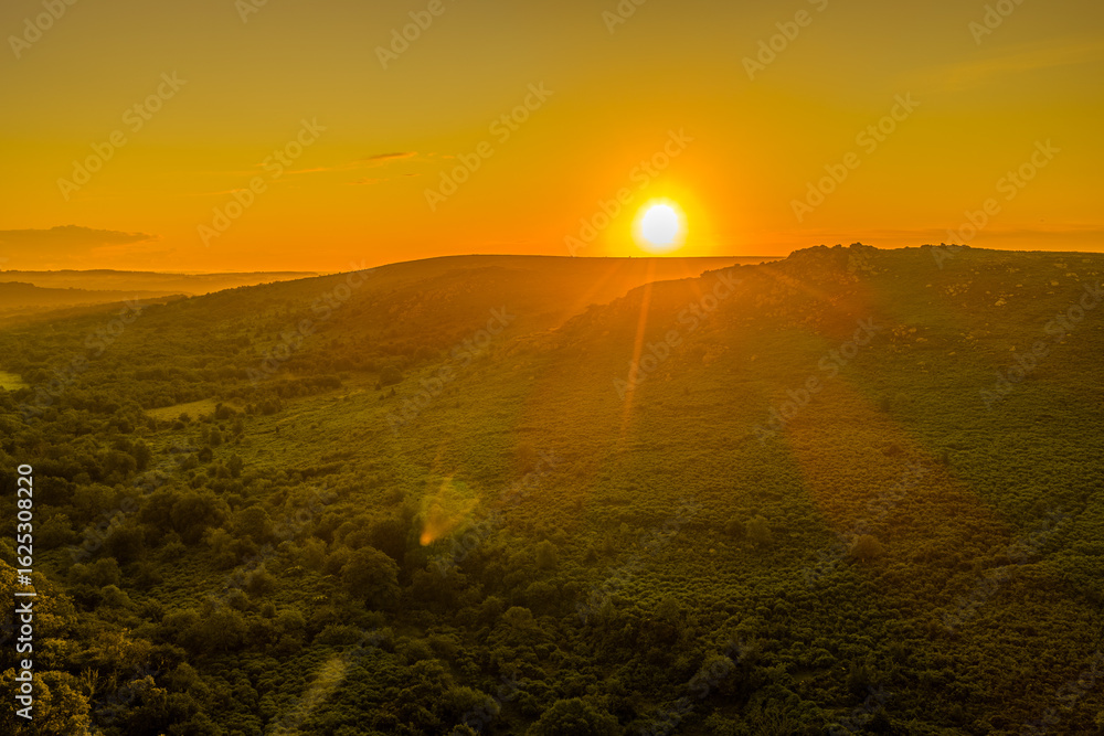 Golden sunrise over the rocky tors of Dartmoor, casting warm light across the rugged moorland and rolling hills