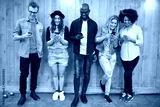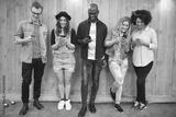 Cheerful multiracial friends messaging with smartphones at wooden wall