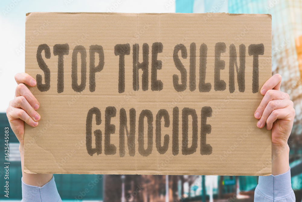 “Stop the Silent Genocide” highlighting mass violence and conflict. JUSTICE. HELP. CRY. RIGHTS. SUFFERING. FIGHT. LIVES.
