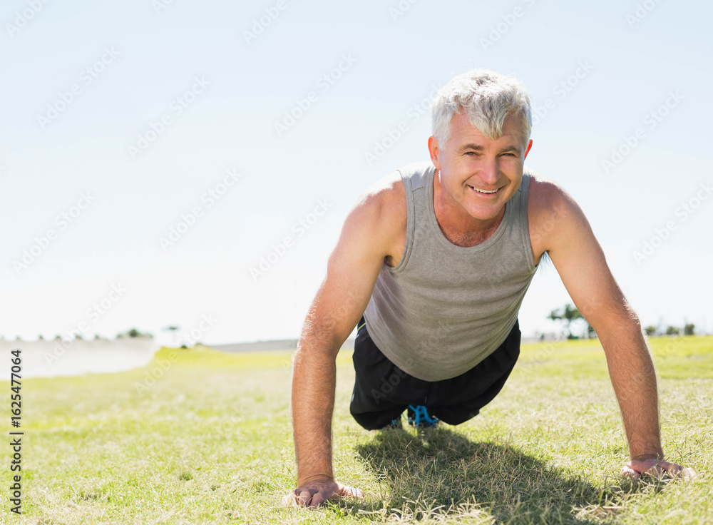 Senior male performing push-ups on grass field wearing grey tank top and blue-accented sneakers