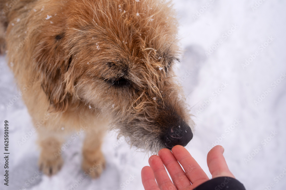 Red big sad shaggy dog in the snow and a person's hand stretched out to her, soft selective focus. Conceptual image of friendship, trust, love between a person and a dog. Homeless street animals.