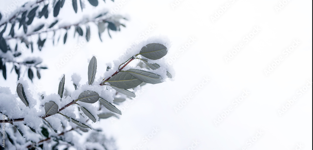 Plant background with snowy green feijoa tree branch in winter, soft focus, copy space.