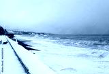 Embankment of Kobuleti in snowy winter with a view of stormy Black Sea, pebble beach in cloudy weather, Georgia, Adjara. Seascape.