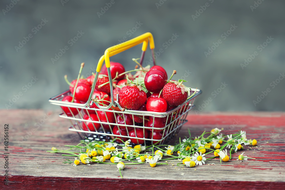 Summer harvest fresh fruits cherries strawberries in shopping basket. Shallow depth field, selective focus, wooden background with daisy flowers.