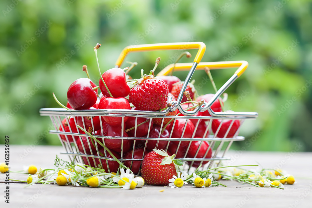 Summer harvest fresh fruits cherries strawberries in shopping basket. Shallow depth field, selective focus, wooden table background with daisy flowers.