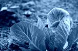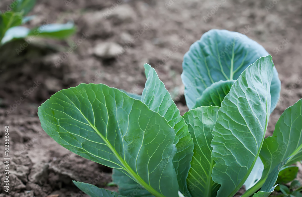 White cabbage field landscape. Green leaves agriculture farmers plant. Selective focus.