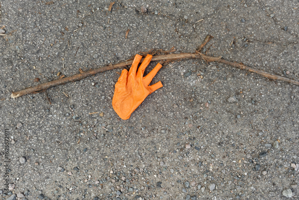 stick and an orange rubber glove on asphalt