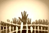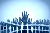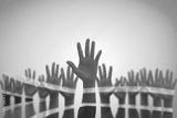 South Africa national flag on leader's palms isolated on blue sky for human rights, leadership, reconciliation concept