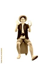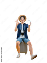 A young man in travel attire holding a mobile phone and sitting on luggage, displaying a positive hand gesture on png background