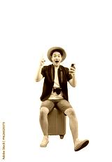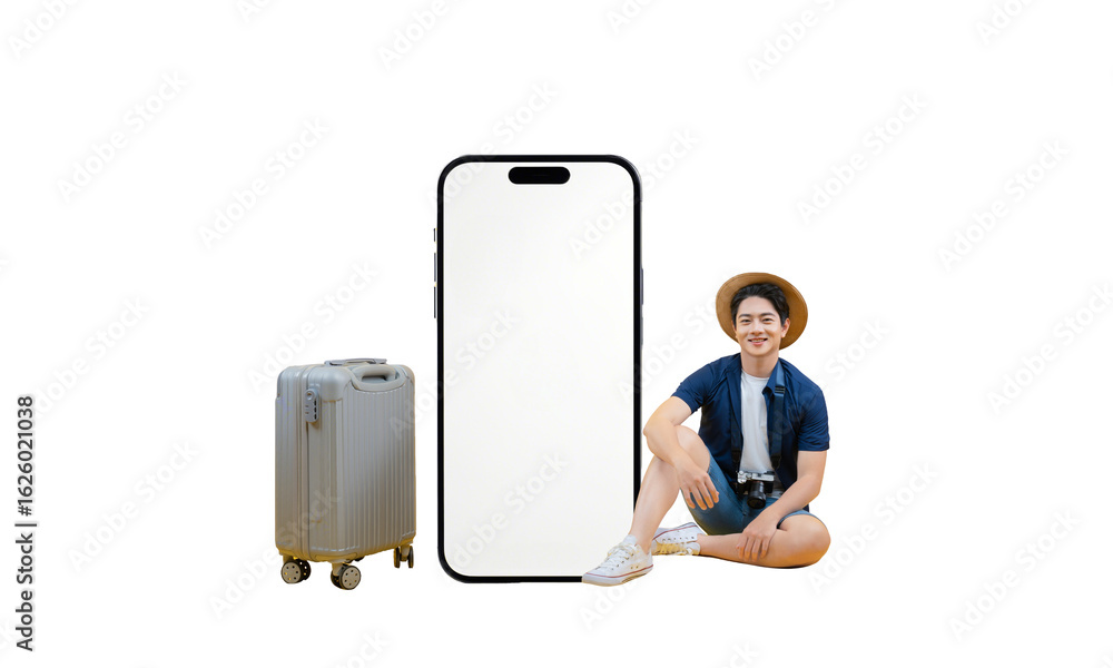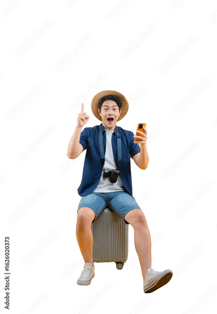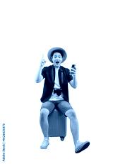 A young man sitting on a suitcase, wearing a hat and holding a phone, looks surprised on png background