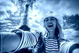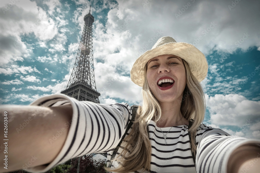 Woman tourist selfie near the Eiffel tower in Paris under sunlig
