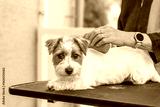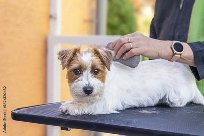 Jack Russell dog lying on a table is being groomed by a groomer using a trimming stone. The dog is looking at the camera.