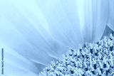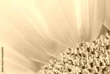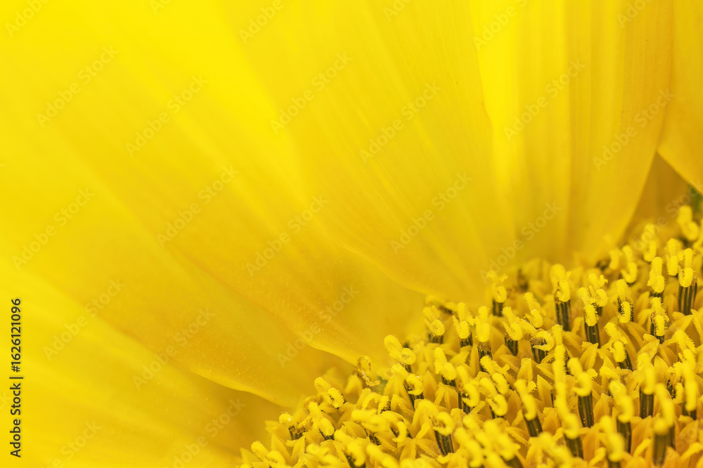 Macro photo of sunflower stamens and pistils in the corner of the photo. Copy space is on most of the photo, which consists of yellow petals. Horizontal.