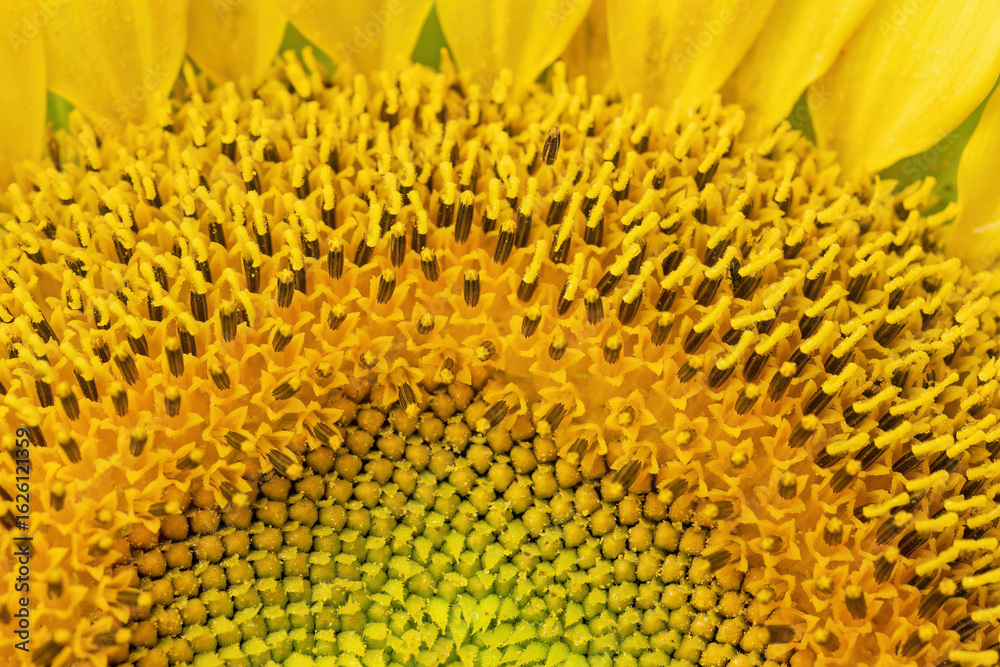 Focused macro photo of sunflower stubble lined with stamens and pistils. Horizontal.