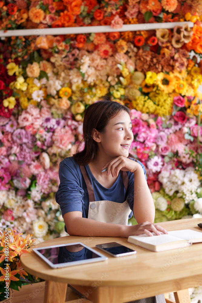 Asian female florist small business owner planning creative ideas for artificial flower shop digital marketing