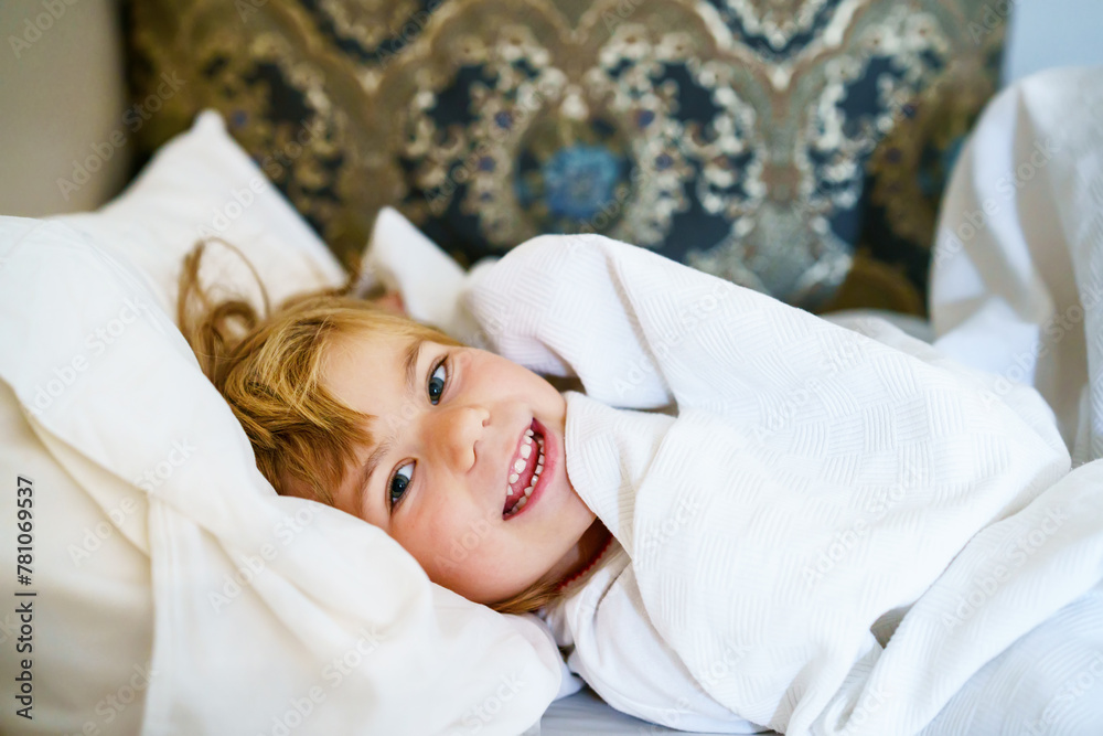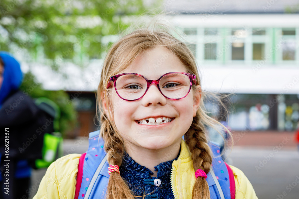 Little girl walking to school. Cute child with satchel and eyeglasses on school yard. Back to school. Happy school time.