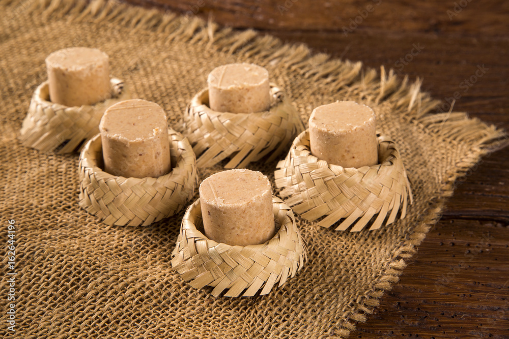 Pacoca - brazilian candy of ground peanut with wicker hat of festivity festa junina decoration.