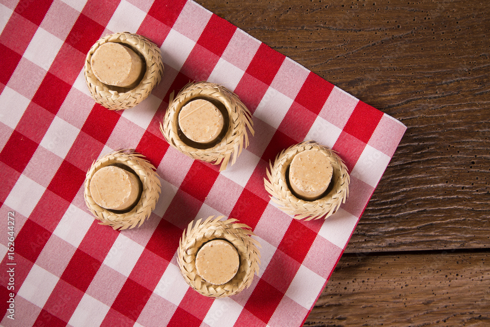 Pacoca - brazilian candy of ground peanut with wicker hat of festivity festa junina decoration.